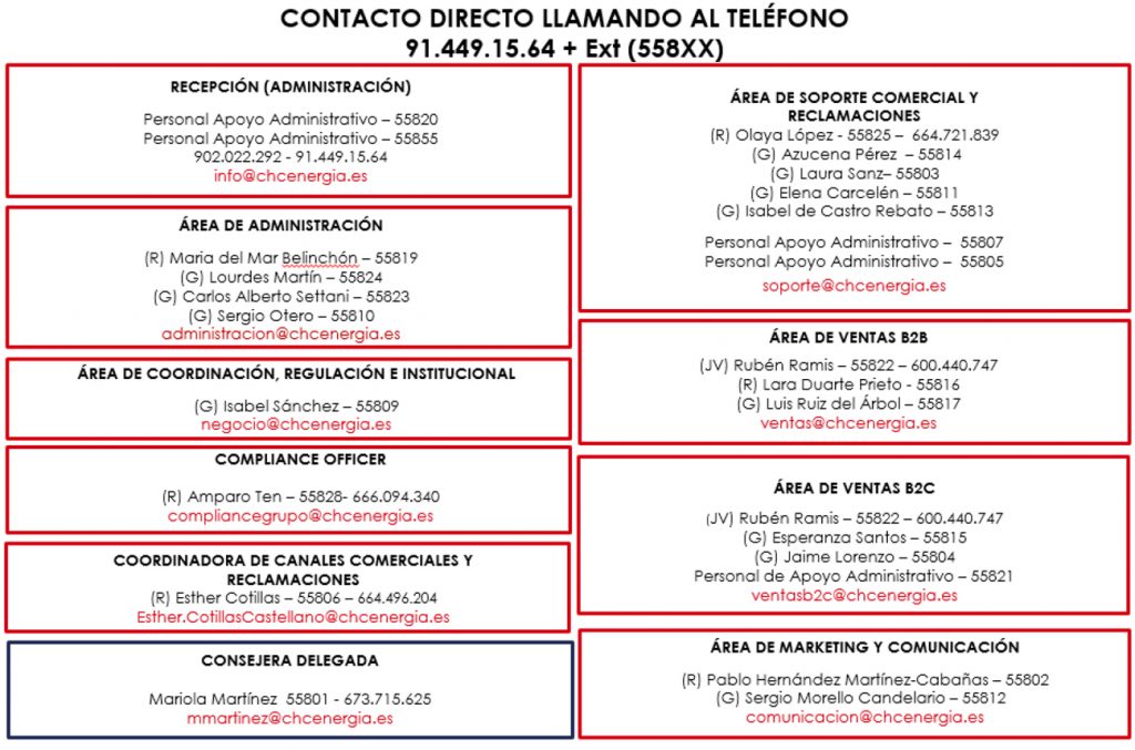 Si algo nos caracteriza en CHC Energía, es la atención personalizada a nuestras delegaciones comerciales. Por este motivo, para que podáis contactar con todos nosotros siempre que los necesitéis os mostramos el listado actualizado de extensiones por Unidad de Negocio.
