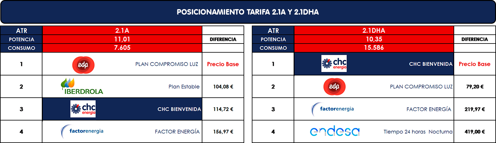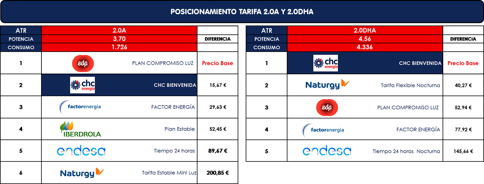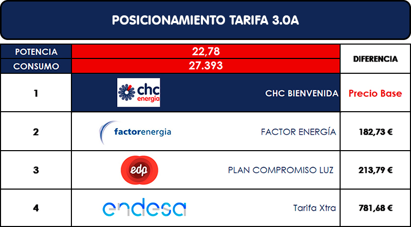 Gracias a esta reducción de precios, CHC Energía cuenta una buena posición competitiva en el mercado, hemos hecho una comparativa con las compañías que no operan de manera online y este es el resultado: