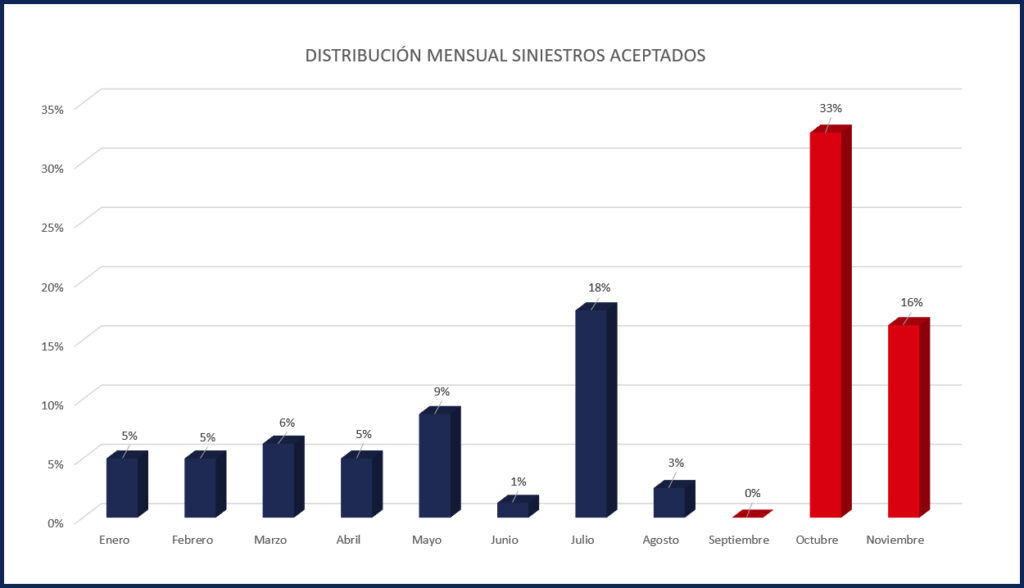 Como sabes, el Seguro Tranquilidad tiene unos plazos de carencia, lo que provoca que la aceptación de la cobertura no sea inmediata y por ese motivo el crecimiento de las coberturas aceptadas no se produce en el mes de septiembre (mes en el que lanzamos la primera campaña), si no que tienen lugar en los meses de octubre y noviembre con un 34% y un 15% del total de las coberturas de todo el año, es decir 1 de cada 2 coberturas aceptadas se produjeron en estos dos meses.