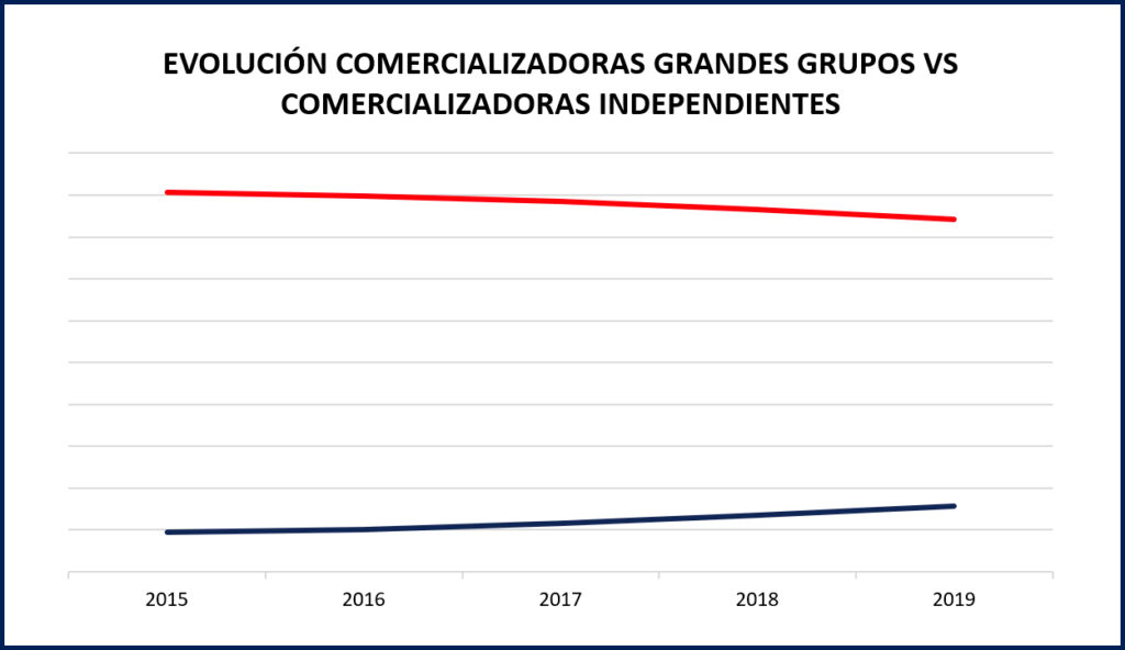 Según el informe elaborado por la CNMC, el 16% de los clientes que se encuentran en mercado libre, son suministrados por comercializadoras independientes, es decir aquellas que se encuentran fuera de los grupos Iberdrola, Endesa, Naturgy, Repsol y EDP.