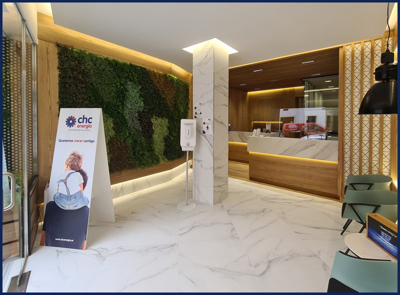 Con esta nueva imagen, han conseguido crear un entorno agradable para visitantes y empleados, gracias al gran jardín vertical e iluminación tenue que enmarca el espacio.