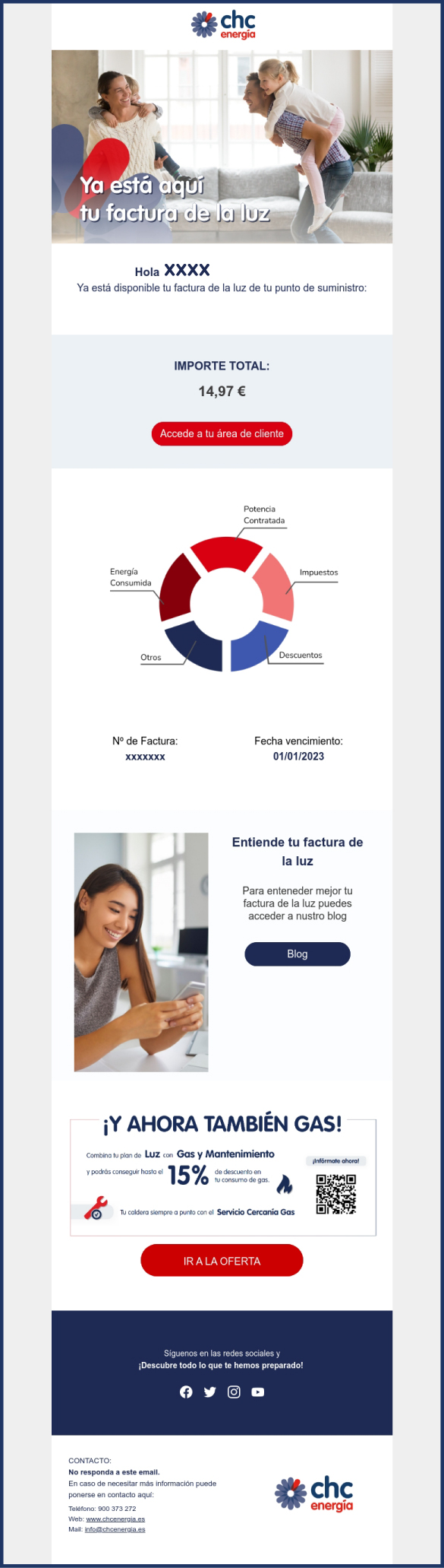 Renovamos el correo electrónico de facturación electrónica con un nuevo diseño, ideado para mejorar su visualización y en el que facilitamos el acceso a información de interés para que podáis entender mejor la factura o acceder a los descuentos del Club CHC.