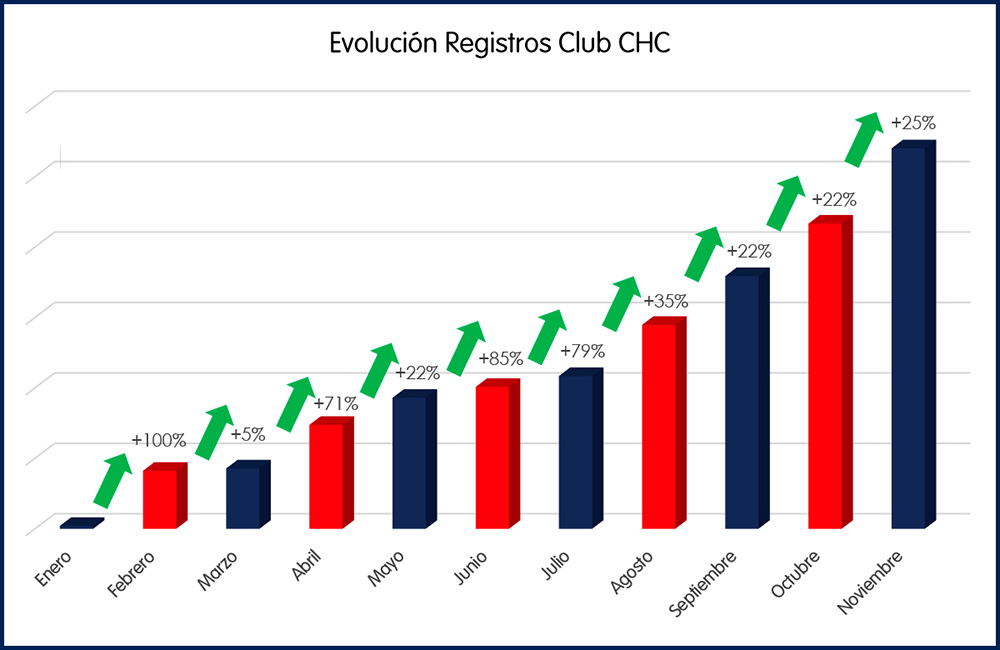 Cada vez son más los clientes que se dan de alta en el Club CHC para disfrutar de estas ventajas únicas. Puedes ver el crecimiento de registros a continuación: