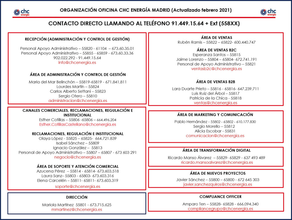 Nos gustaría recordarte el listado de extensiones de todos los compañeros de la oficina de CHC Energía Madrid, para que puedas contactar con la persona que necesites de una forma ágil, porque si algo nos caracteriza en CHC Energía, es la atención personalizada a nuestras delegaciones comerciales.