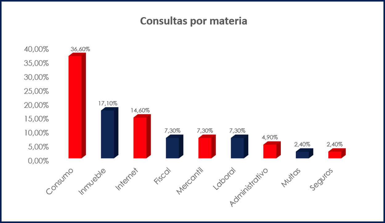 Tras un estudio de todas las consultas realizadas por nuestros clientes, podemos destacar que las materias sobre las que tienen un mayor asesoramiento son: consumo con un 36%, inmueble con un 17% e internet con un 14%, mientras que las relativas a multas y seguros son las que tienen un menor número de consultas con un 2,4% ambas.