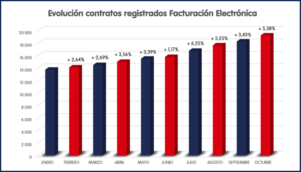 Como puedes apreciar en el gráfico, durante este año hemos tenido un importante crecimiento de contratos regitrados, de hecho este incremento es de un 30%, sin embargo, a pesar de ser un crecimiento alto, debemos seguir trabajando para mejorar la adhesión en esta plataforma.