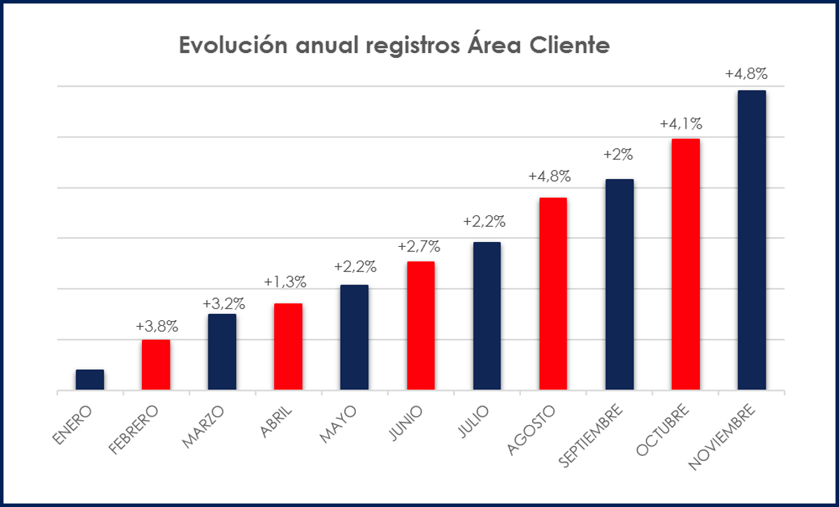 - Área Cliente: como puedes observar en el gráfico, durante el mes de noviembre se ha producido un incremento del 4,8% de registros (igualando al mes de agosto). Esta evolución ha situado el crecimiento anual en más de un 36%.