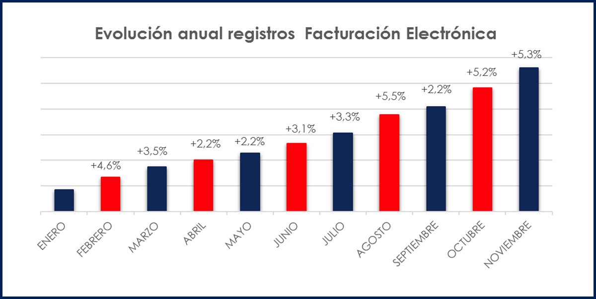 - Facturación Electrónica: durante el mes de noviembre se ha producido un incremento del 5,3% de registros (siendo el segundo mejor mes del año). Este incremento ha situado el crecimiento anual en más de un 44%.