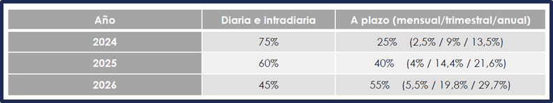 Parte del precio se fijará en los mercados de futuro, de manera que, tal y como puedes ver en la siguiente tabla, representará un 25% en 2024, un 40% en 2025 y el 55% en 2026.