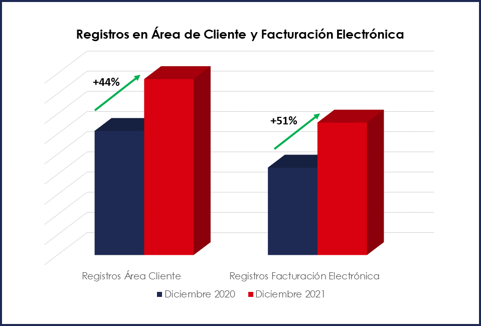 El año pasado conseguimos un crecimiento de un 44% en el Área Cliente y más de un 50% en Facturación Electrónica, lo que significa que 2021 se convirtió en el mejor año de registros en este servicio Te mostramos está información de manera gráfica a continuación: