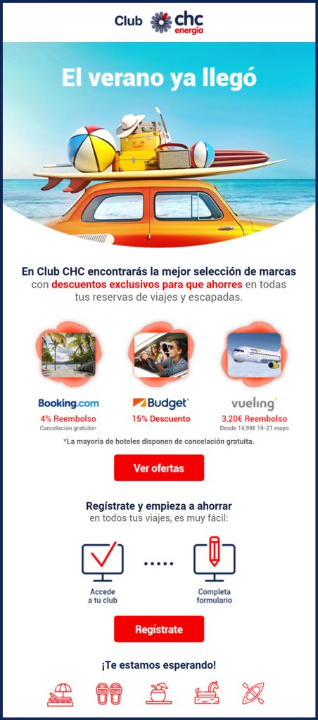 Que mejor momento para ofrecer un valor añadido al cliente, que ayudándole a ahorrar en la reserva de sus vacaciones. Por ello, hemos lanzado una campaña emailing, recordando las ventajas del Club CHC e incentivando el registro.