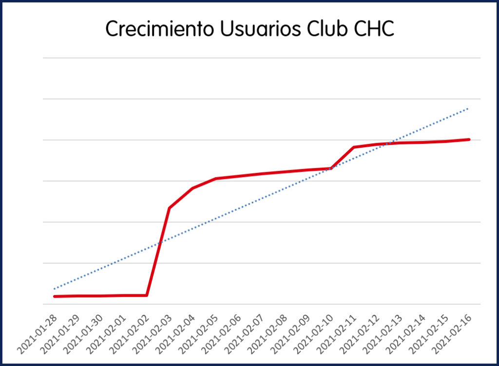 Como se aprecia, el día 3 de febrero se incrementó notablemente el numero de registros en el Club CHC, pero seguimos creciendo paulatinamente y a día de hoy, alrededor del 5% de los usuarios dados de alta en Área Cliente ya se han registrado en nuestro programa de fidelización. Desde CHC Energía consideramos estos datos muy positivos, sabemos que el Club CHC tiene todavía mucho recorrido entre nuestros clientes y se convertirá en una herramienta importante para la captación y retención de clientes.