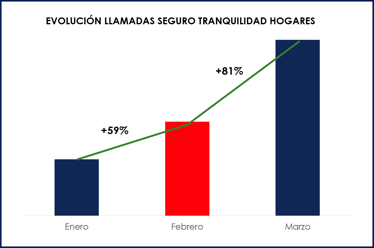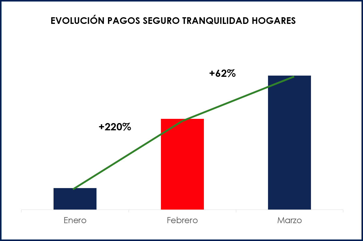 De esta forma, podemos comprobar en los siguientes gráficos que la evolución de las llamadas para solicitar el Seguro Tranquilidad Hogares ha sido al alza durante el primer trimestre de 2022, así como los pagos que se han efectuado en el mismo periodo de tiempo.
