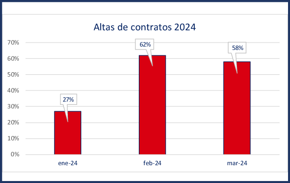 En el transcurso de la evolución de altas durante los primeros meses de 2024, el mes de febrero y hasta la fecha del mes de marzo ha demostrado ser un período positivo en comparación con el mes de enero. El punto de inflexión se ha materializado tras la celebración de la reciente Convención Comercial de CHC Energía, dejando una huella significativa en el comportamiento comercial de algunas delegaciones comerciales.