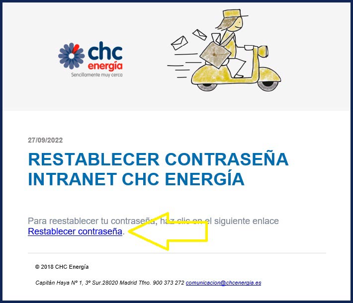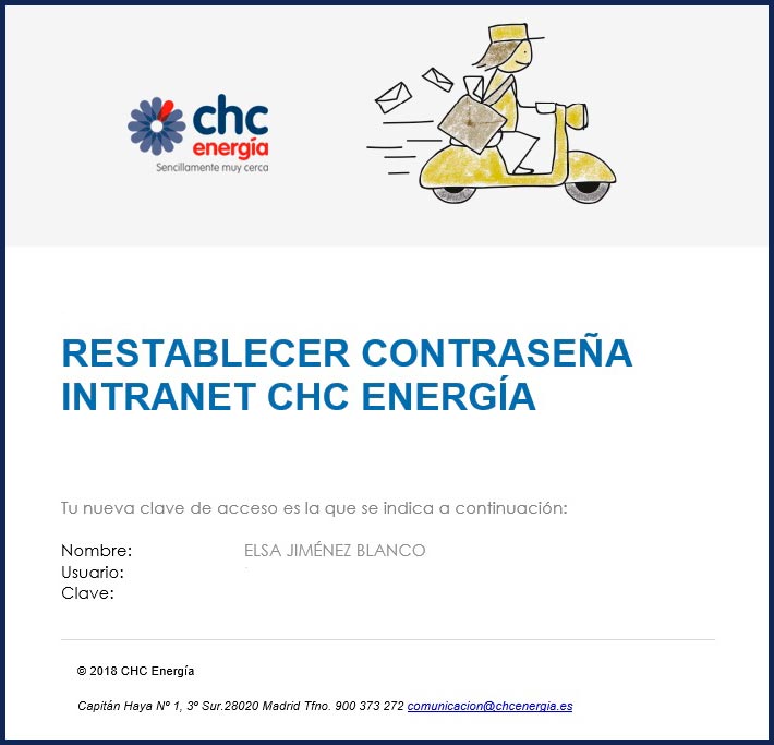 Con la finalidad de mejorar el uso de la Intranet de CHC Energía, y de que podáis ser autónomos a la hora de restablecer la contraseña si se os ha caducado, a partir de ahora podréis resetearla a través de los emails a los que estén asociados vuestros usuarios.