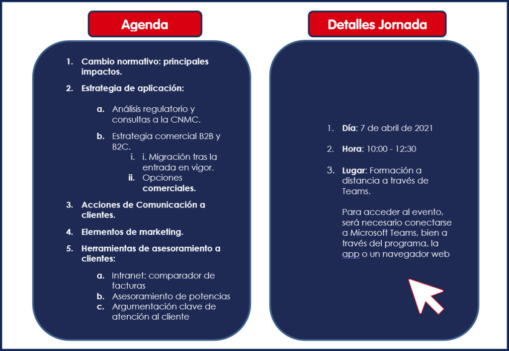 Como te comunicamos al principio del mes de marzo, el próximo 7 de abril, CHC Energía organizará una formación virtual con el objetivo de profundizar sobre el cambio normativo y la estrategia de aplicación y comunicación de las nuevas tarifas del sector eléctrico.