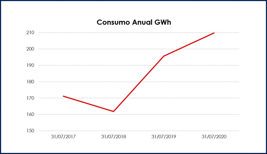 Analizando el gráfico hemos pasado de un consumo de 170 GWh en 2017 a casi 210 GWh en 2020, significando un incremente mayor del 22%. Y todo esto es gracias a vosotros, a las delegaciones comerciales, por vuestra labor diaria, persistencia y las ganas de seguir creciendo.