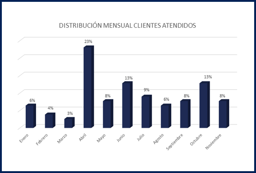 Como puedes apreciar en el gráfico anterior, el 23% de los clientes fueron atendidos en el mes de abril, lo que significa que nuestro Servicio Tranquilidad Negocios fue muy útil para paliar la incertidumbre que esta situación tan atípica e inesperada provocó en las pymes y autónomos clientes de CHC Energía. Sin embargo y como es lógico con los meses de verano disminuyó (9% en julio, 6% en agosto y 8% en septiembre) pero se vuelve a incrementar en otoño, con la reactivación económica (13% en octubre y un 8% en noviembre).