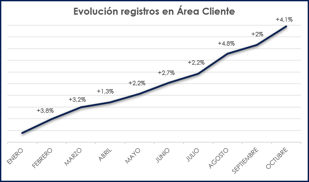 Como habéis podido comprobar, octubre ha sido un buen mes en cuanto al registro en el Área Cliente y Facturación Electrónica con un 4,1% y 5,2% respectivamente.