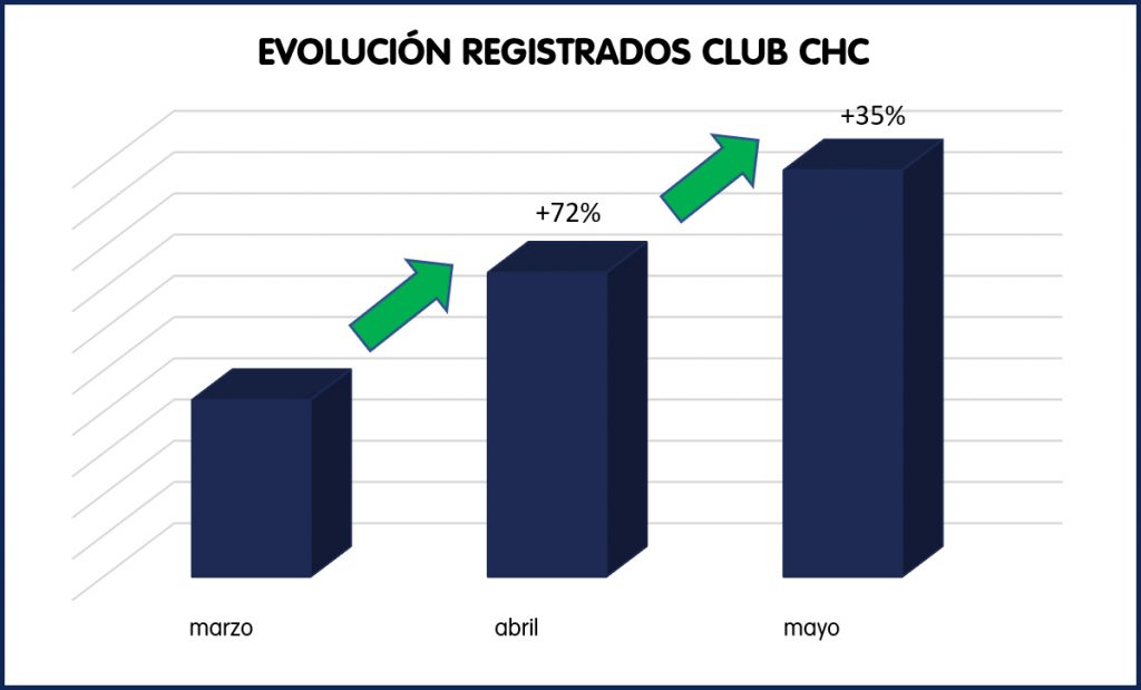 Como puedes observar en el gráfico, las campañas han ayudado a incrementar el registro de los clientes en el Club CHC en un 72% durante el mes de abril y en un 35% durante el mes de mayo.