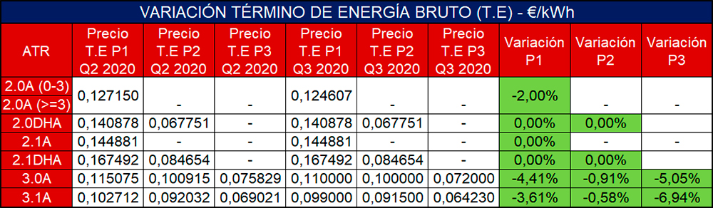 A continuación, os mostramos una tabla donde podréis apreciar la variación del precio de venta del término de energía bruto por cada tarifa de acceso:
